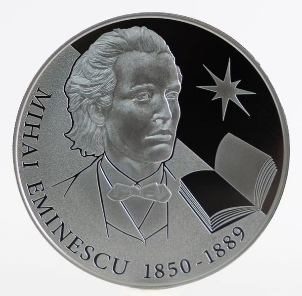 Надписи по окружности заглавными буквами: «MIHAI EMINESCU» и годы жизни «1850–1889».
