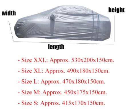 Car cover for cars standing in the open air. Protection against the sun, reflector of rays, dust, bird and bee droppings. ON ORDER! Production time from 35 + days, select the desired size (cm), strictly from the list. Colour: SILVER. Prices are indicative!