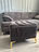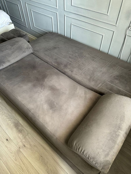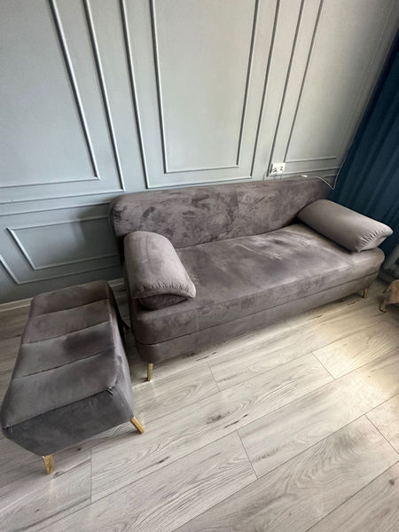 Позолоченные ножки в стиле арт деко, серый велюр, есть пространство для хранения внутри дивана.