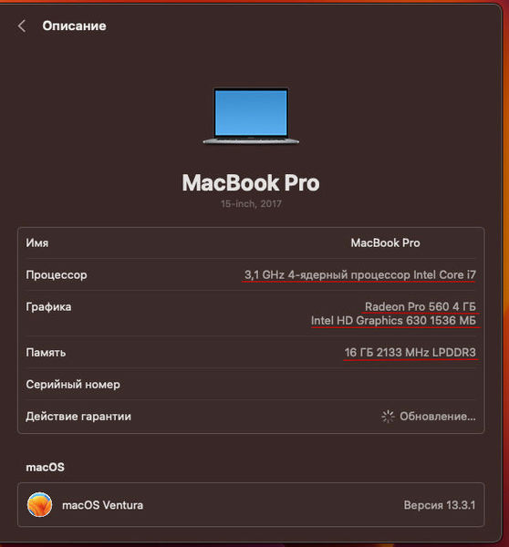 Procesor: 3,1 GHz (Turbo Boost pină la 4,1 GHz) Intel Core i7 (cu patru nuclee), Grafica: Radeon Pro 560 4GB + Intel HD Graphics 630 1536 MB, RAM: 16 GB 2133 MHz LPDDR3, APPLE SSD: 512 GB, Systema: macOS Ventura.