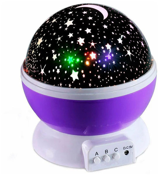 Он осветит комнату вашего малыша прекрасными звездами и луной. Характеристики: 1.Создаёт движущиеся проекции на стены и потолок; 2. Источник света: 4 светодиодных ламп; 3. Режимы работы: 3 кнопки (вращение, белый свет, разноцветное свечение).