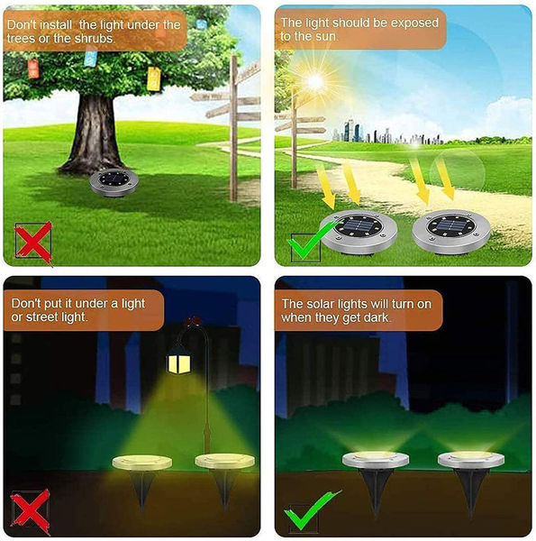 Автоматическое включение/выключение: наружные солнечные фонари автоматически включаются в темноте или ночью и выключаются днем или в ярко освещенном месте. Солнечные дисковые фонари со встроенным Ni-MH аккумулятором большой емкости 600 мАч. Для полной зарядки требуется всего 6-8 часов, а время работы может составлять 8-10 часов. (Время работы будет меняться в зависимости от погоды.)