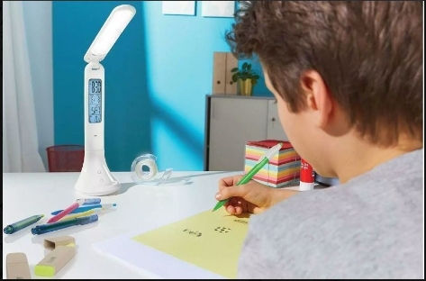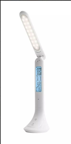 Настольная светодиодная лампа со встроенным аккумулятором и часами, белая и черная.