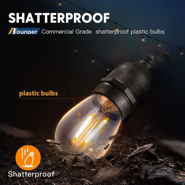 BBOUNDER String de iluminat pentru exterior, alimentat la rețea, 15metri LED S14 șir de lumini de grădină cu 15 becuri din plastic, rezistente la intemperii, pentru interior/exterior, șir de lumini pentru grădină, pergolă, bar, petrecere de nuntă [Clasa de energie A+++]