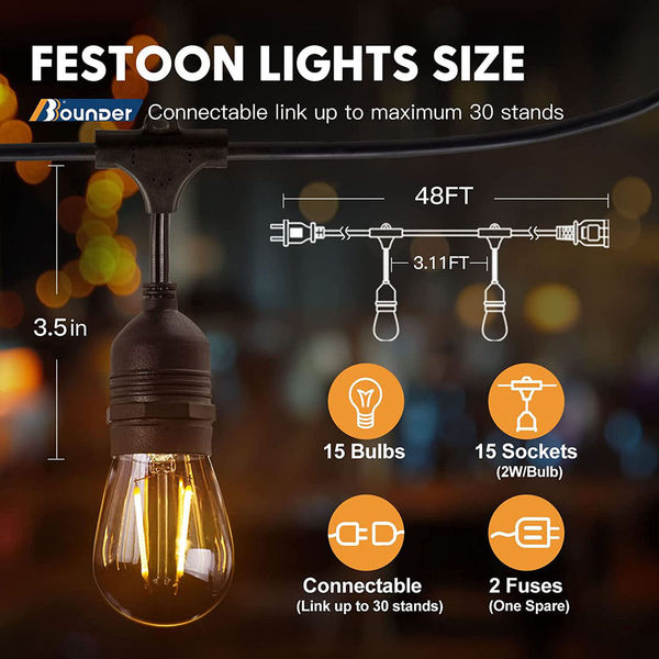 Iluminat fantastic pentru decorare în aer liberLungimea totală a luminilor este de 15metri, distanța dintre fiecare bec este de 3,11FT. Fiecare suport conține prize suspendate pe bază de E27, prevăzute cu becuri LED rezistente la spargere. Becul LED retro emite o lumină albă caldă, care vă oferă o stare de spirit plăcută. Este o alegere ideală pentru decorarea grădinii, petrecerile de Crăciun și de sărbători pentru a crea o atmosferă confortabilă și romantică.