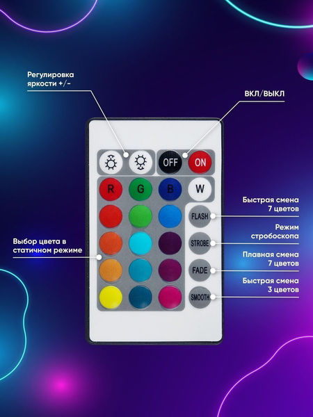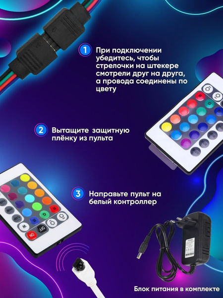 Светодиодная RGB лента 5м цветная в катушке с пультом и блоком питания. Диодная лента оснащена диодами ТОЛЬКО ТРЕХ ЦВЕТОВ: красным, зеленым и синим. Остальные цвета получаются путём слияния их в разных вариациях контроллером (наглядно в отзывах). Неоновая лента влагостойкая, IP67. Низкое энергопотребление, свет супер-яркий, работает при низкой температуре. Лента полностью гладкая. Каждый 1 метр можно разрезать, не повреждая остальные полоски, согласно вашему требованию, но светить будет только та часть, которая ПОДКЛЮЧЕНА К СЕТИ. Длительный срок службы, более 50000 часов. Используется в качестве освещения для кухни, комнаты, как гирлянда, лампа, светильник, подсветка уличная, для монитора, телевизора. Основные моменты: 1)При подключении убедитесь, что стрелочки на штекере смотрят друг на друга, а провода соединены по цвету (синий к синему, красный к красному) 2)Вытащите защитную пленку из пульта 3)Направьте пульт на белый контролер.