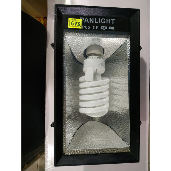 Proiector cu lampă fluorescentă economică 80 wați, soclu E40, lampă incandescentă echivalent 400 wați. Lampa poate fi oricând înlocuită.